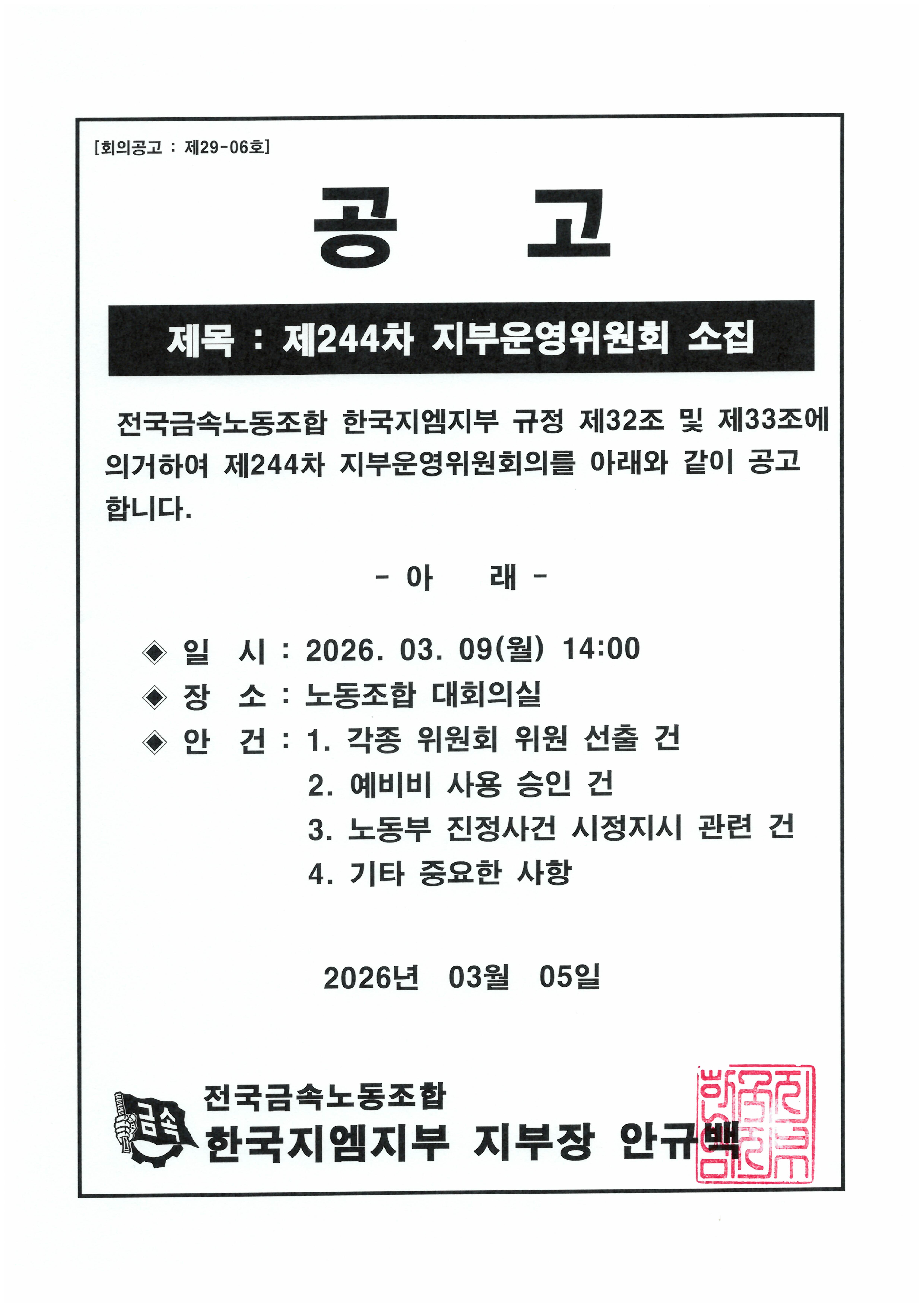 Àü±¹±Ý¼Ó³ëµ¿Á¶ÇÕ Á¦14±â ÀÓ¿ø¼±°Å °ø°í