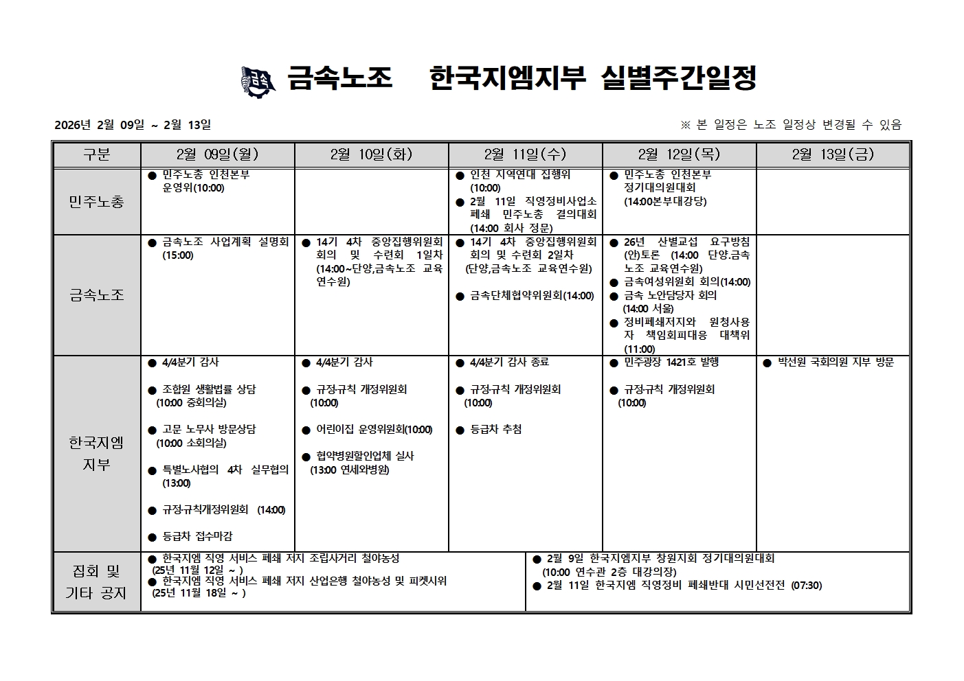 2026³â 2¿ù 9ÀÏ ~ 2¿ù 13ÀÏ ÁÖ°£ÀÏÁ¤Ç¥ ÀÔ´Ï´Ù