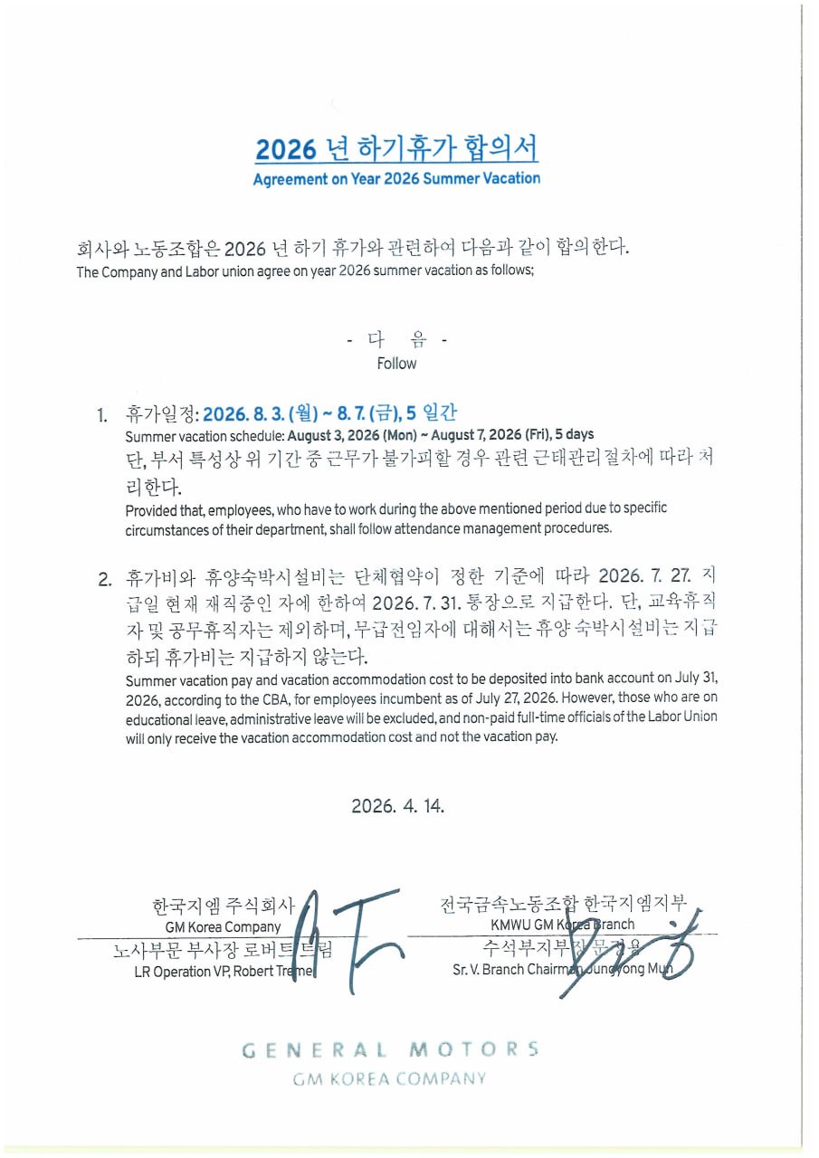 ȸ»ç¿Í ³ëµ¿Á¶ÇÕÀº 2026³â ÇϱâÈÞ°¡¿Í °ü·ÃÇÏ¿© ´ÙÀ½°ú °°ÀÌ ÇÕÀÇÇÑ´Ù.