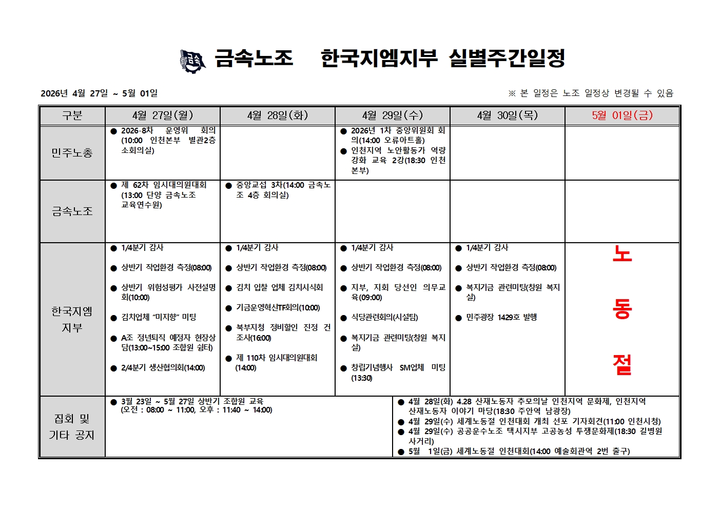 2026³â 4¿ù 27ÀÏ ~ 5¿ù 1ÀÏ ÁÖ°£ÀÏÁ¤Ç¥ ÀÔ´Ï´Ù