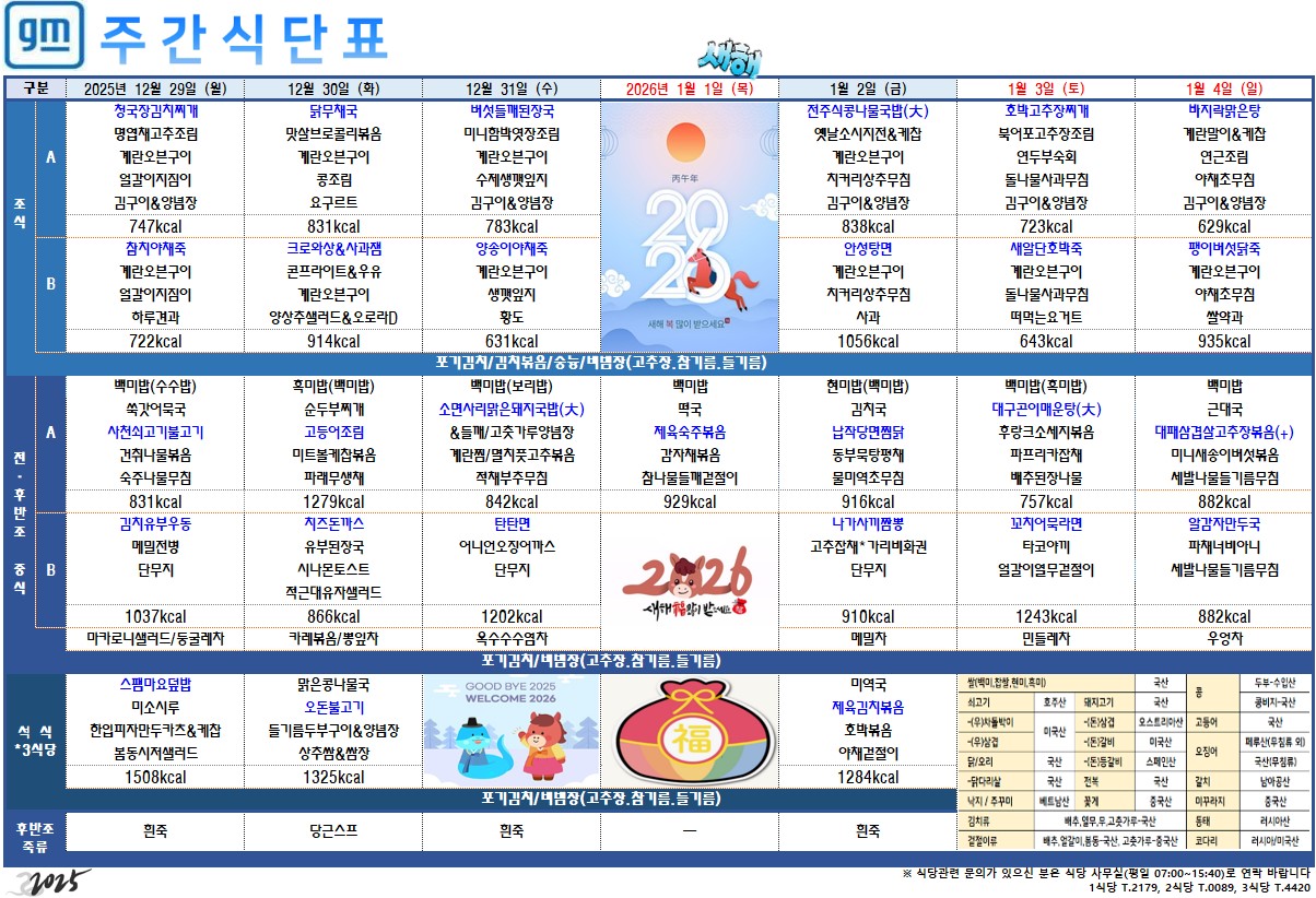 2025³â 12¿ù 29ÀÏ ~ 2026³â 1¿ù 4ÀÏ ÁÖ°£½Ä´ÜÇ¥ÀÔ´Ï´Ù.