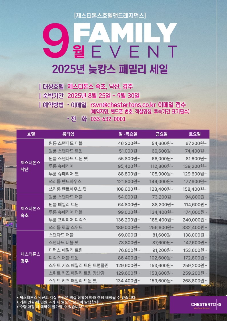 À̸ÞÀÏ rsvn@chestertons.co.kr Á¢¼ö(¿¹¾àÀÚ¸í, ÇÚµåÆù ¹øÈ£, °´½Ç¸íĪ, Åõ¼÷±â°£ Ç¥±â Çʼö)