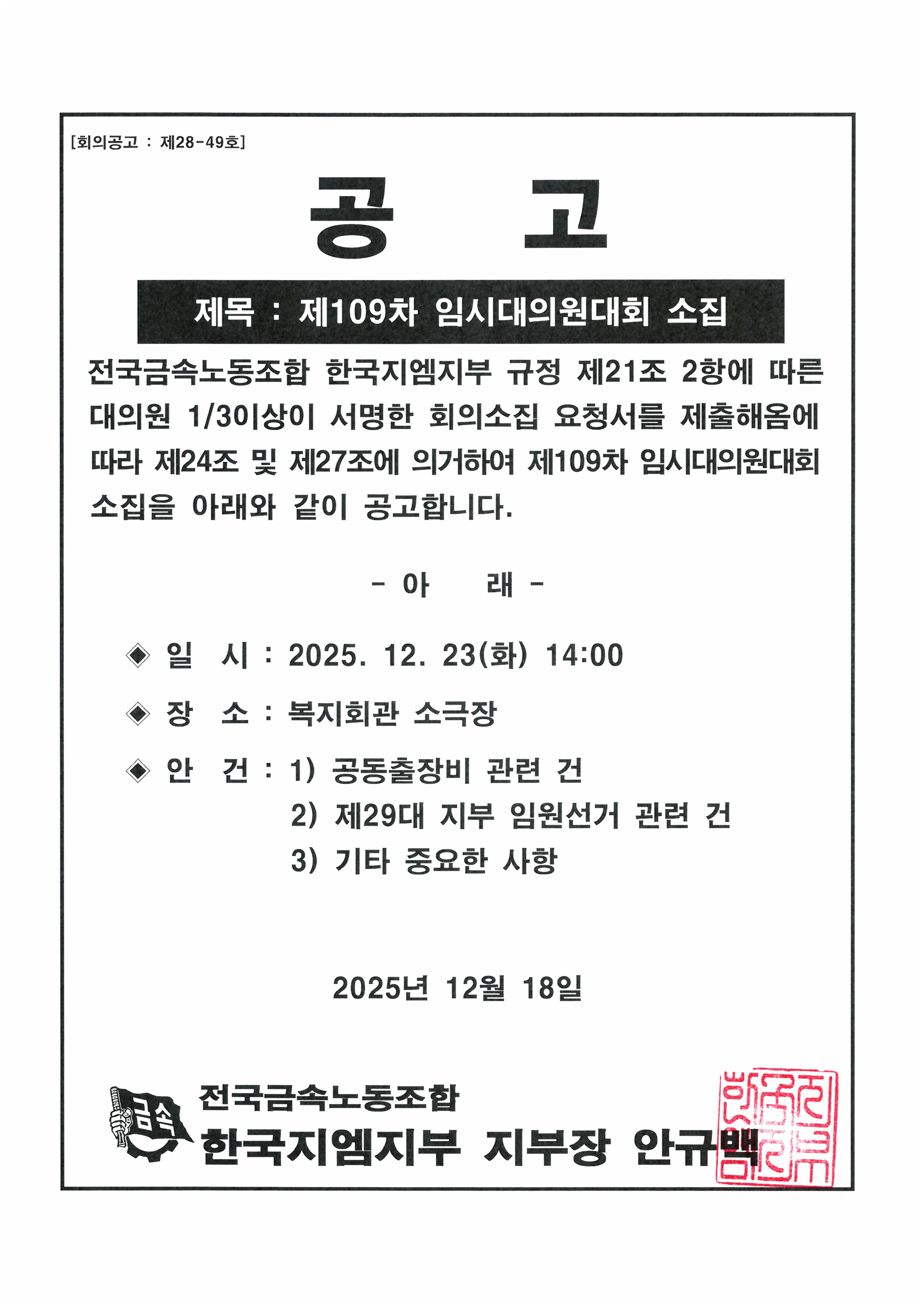 Á¦109Â÷ ÀӽôëÀÇ¿ø´ëȸ ¼ÒÁý °ø°í