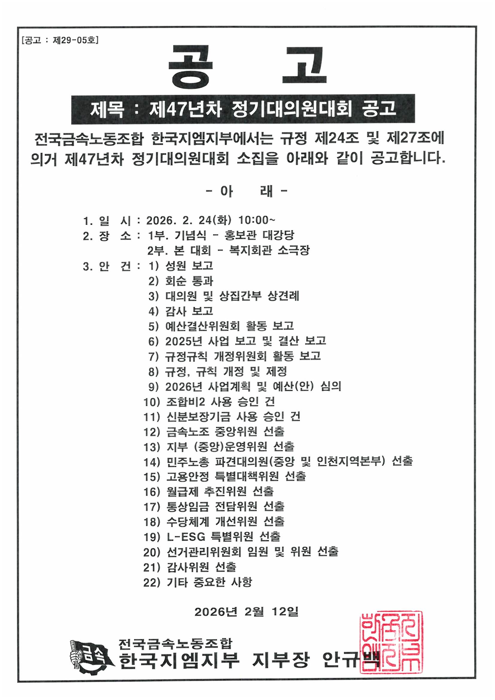 Àü±¹±Ý¼Ó³ëµ¿Á¶ÇÕ Á¦14±â ÀÓ¿ø¼±°Å °ø°í