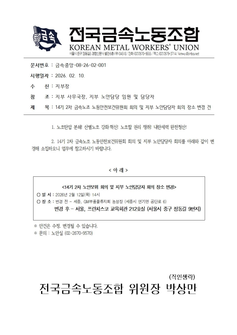 [³ëµ¿¾ÈÀüº¸°Ç½Ç] (02/12) 14±â2Â÷ ±Ý¼Ó³ëÁ¶ ³ëµ¿¾ÈÀüº¸°ÇÀ§¿øÈ¸ ȸÀÇ ¹× ÁöºÎ ³ë¾È´ã´çÀÚ È¸ÀÇ ¼ÒÁý