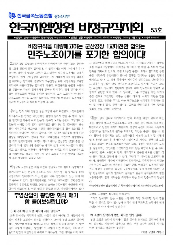 <53È£> ºñÁ¤±ÔÁ÷À» ´ë·®ÇذíÇÏ´Â ±º»ê°øÀå 1±³´ëÀüȯ ÇÕÀÇ´Â ¹ÎÁÖ³ëÁ¶À̱⸦ Æ÷±âÇÑ ÇÕÀÇÀÌ´Ù!